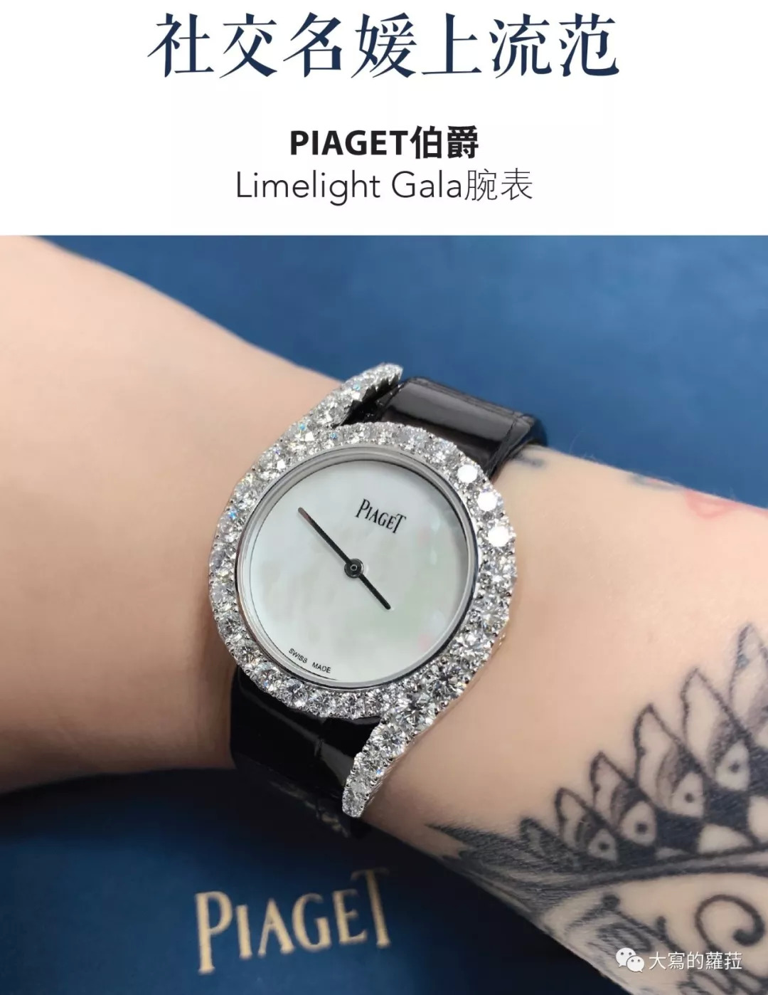 △ 18K白金表壳直径32毫米,表圈镶嵌42颗钻石,黑色短稳鳄鱼皮表带,搭载石英机芯,参考定价400,000人民币。