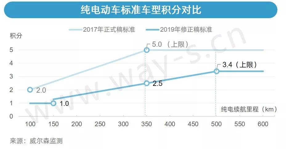 以纯电动车为例,原先标准车型积分在2.0~5.0之间,纯电续航里程只要达到100km就可以拿2分,续航350km就能拿满5分。此次修正案设置了150km的门槛,低于门槛的统一只给1分;而到500km标准车型积分就到顶了,即最多只能拿到3.4分。