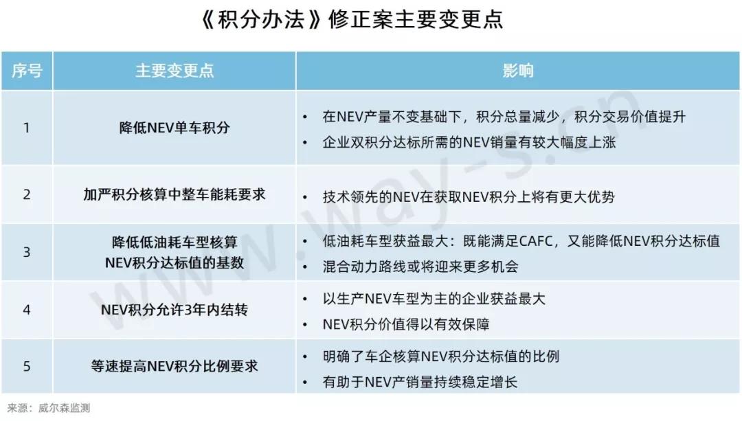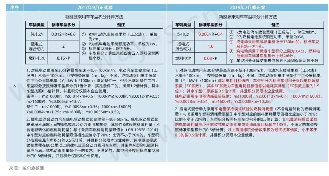 《积分办法》修正案修改了《新能源乘用车车型积分计算方法》,纯电动及燃料电池车型单车标准积分均下降了一半,插电式混合动力车型单车积分从2分下调至1.6分。