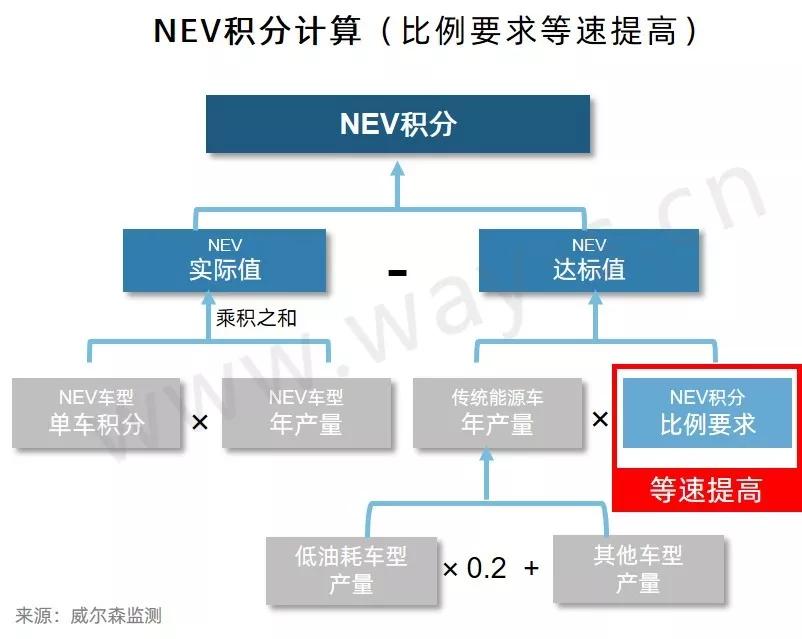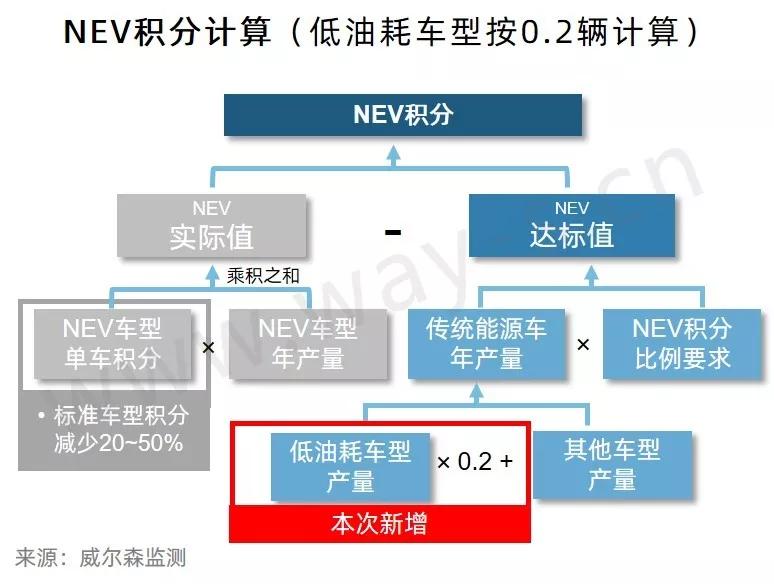 根据修正案,低油耗车型产量按0.2倍计算,则2019年NEV积分达标值为: