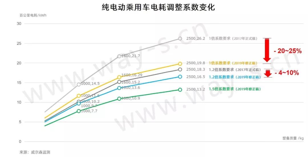 本次修改不再固定设置倍数,而是以车型电耗目标值与实际值的比值作为系数,相比之前更加灵活,系数上限也从原来的1.2倍提升到1.5倍。而在技术要求方面,整备质量相同的基础上,1倍系数的电耗要求比原来加严20~25%左右。