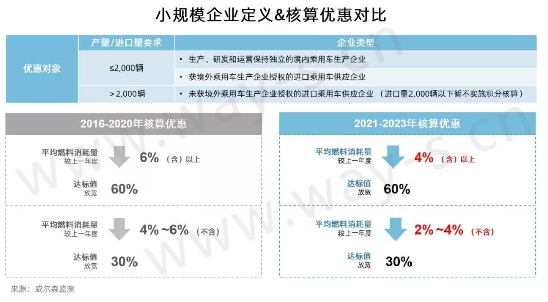 考虑到年产量/进口量2000辆以下的小规模企业,存在产品结构单一等特点,结合未来小规模企业传统能源乘用车油耗下降的潜力,《积分办法》修正案延续了适度宽松考核的优惠。