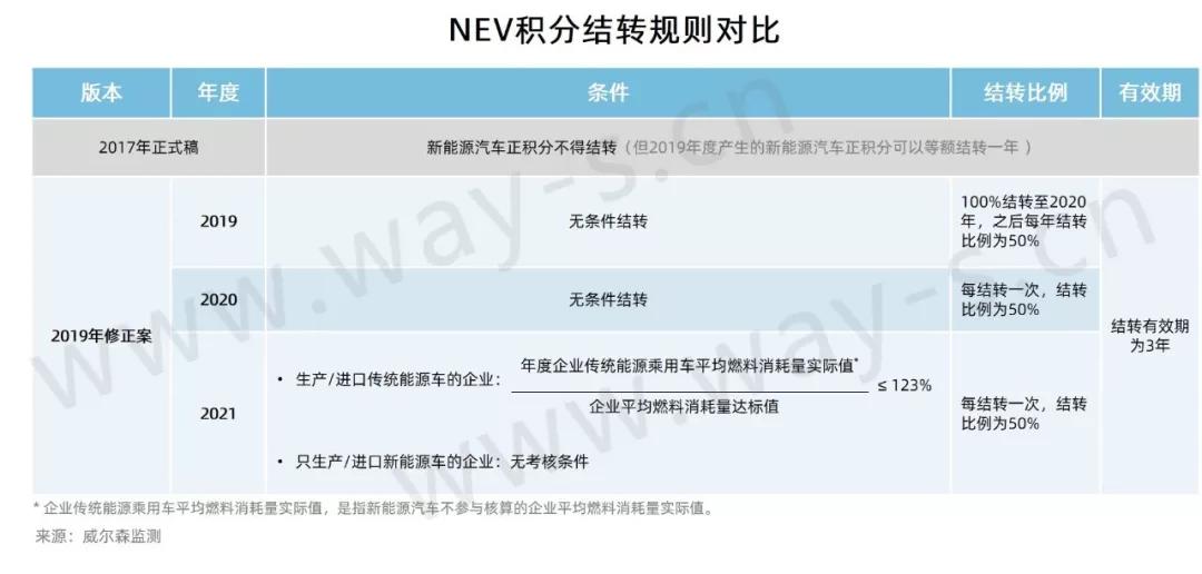 其次,将传统燃油车的节能水平作为2021年度及以后NEV正积分结转的考核条件,在引导企业发展新能源汽车的同时,重视传统能源汽车节能水平的改善,实现传统节能汽车和新能源汽车的协调发展。与此同时,只生产NEV车型的企业因无需考核可直接结转,自然成了最大的赢家。