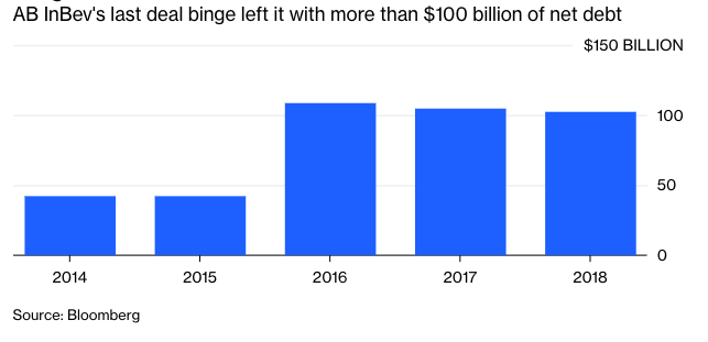 早前在2008年,英博集团(InBev)收购了安海瑟布希(Anheuser-Busch),从而成立这一全球规模最庞大的啤酒集团百威英博;2012年百威集团收购Modelo集团、2016年收购SAB Miller后,债务便居高不下。消费者对于健康和高端化的追求也让大众啤酒的增速放缓,百威的几个主要市场面临市场份额缩水的趋势,更进一步增加了百威的压力。