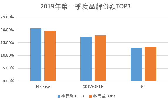 海信电器在市场占有率方面确实有不俗表现:中怡康数据显示,在2019年第一季度彩电人气排行中,线下市场中,海信的畅销型号独具鳌头,海信电视也成为零售额和零售量双冠王。