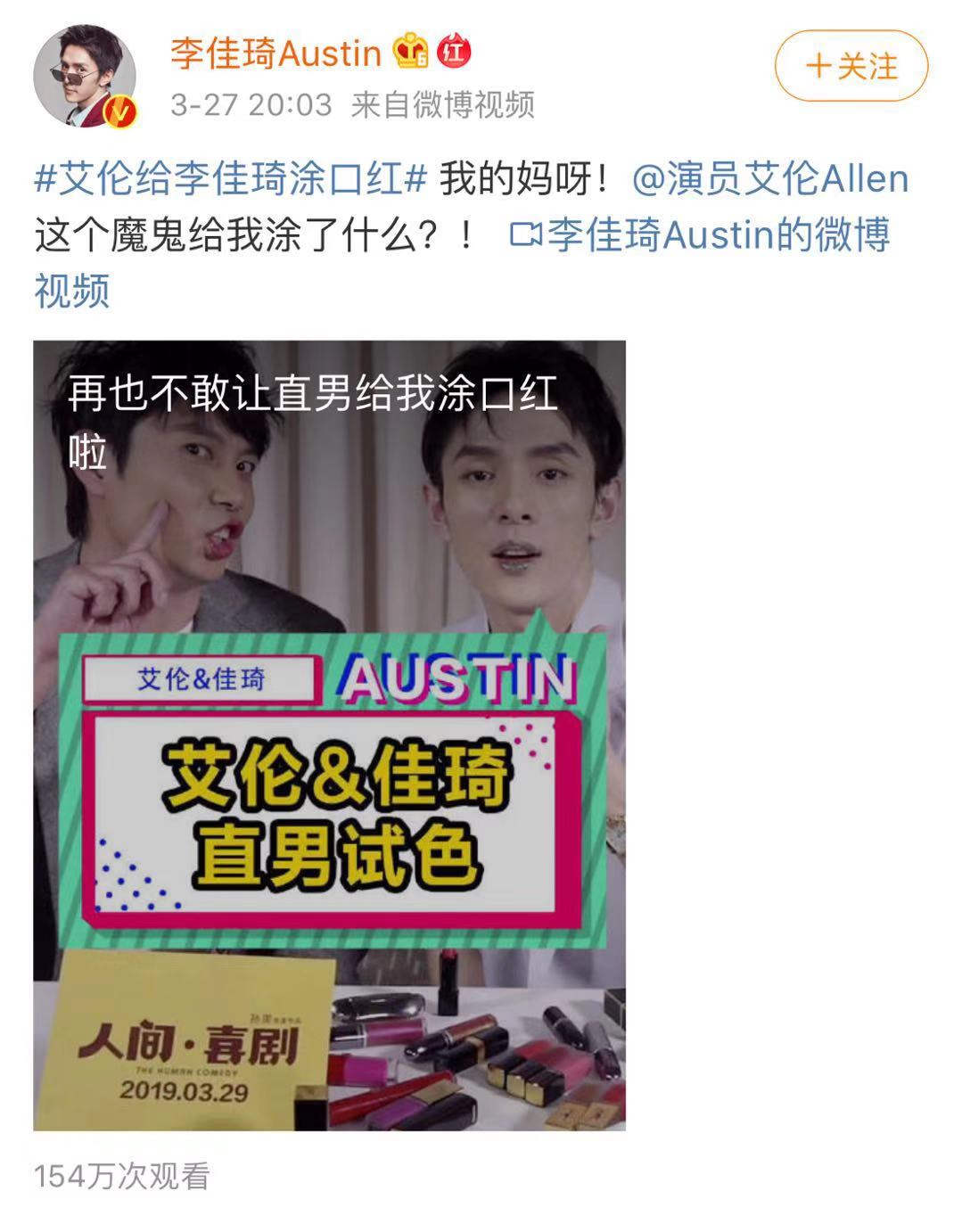 艾伦:我第一次给别人涂口红就献给了李佳琦。我从来没有摸过口红那个东西,对它真的不太熟悉,那天算是佳琦给我上了一课,还告诉我好多想不到的颜色。我以为口红就是里面带颜色的东西,往嘴上抹抹就行了,每天根据不同的心情,想抹什么颜色就抹什么颜色。心情不好就抹一个深色系的,心情好就抹一个艳一点的,我以为就是这样的,但是没有想到这个里面有那么多的讲究,可能我还是不太关注这些东西。