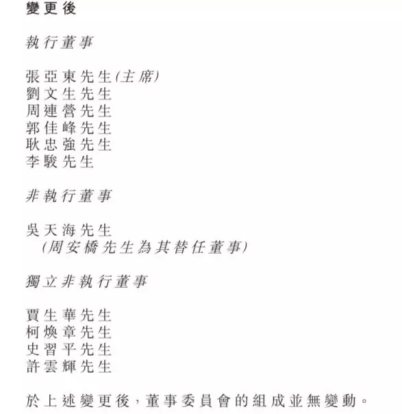 调整后的董事会有10名董事,包含5名执行董事,1名非执行董事和4名独立非执行董事。