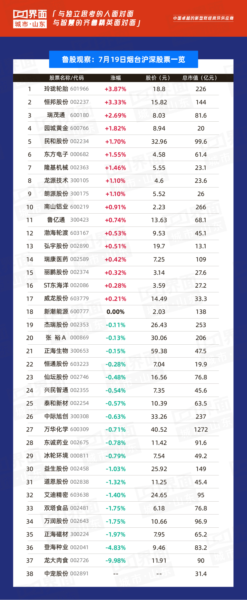 烟台市涨幅榜首:玲珑轮胎(601966),涨幅3.87%,股价18.80元,总市值226亿元。
