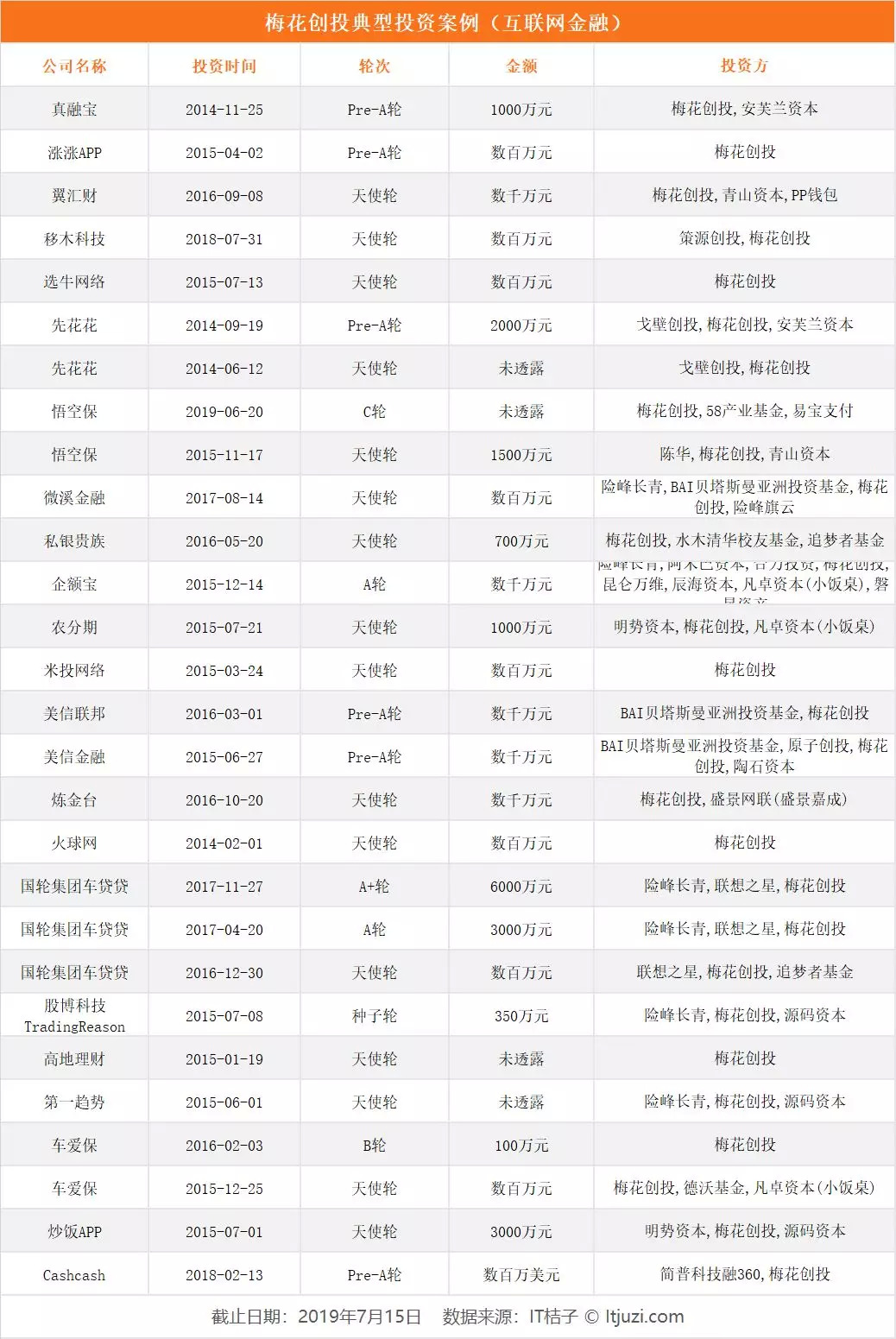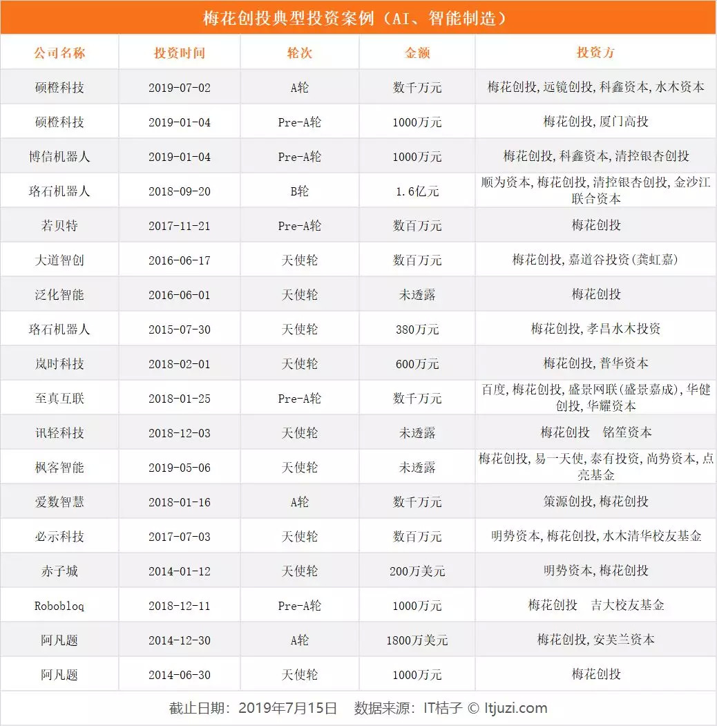 7 月 11 日,梅花创投对外宣布,已于 2019 年第一季度完成第五期天使基金的募集,总规模 5.325 亿人民币。该期基金机构投资人出资超 80%;个人投资人中,有多位为梅花创投已退出项目的创业者。