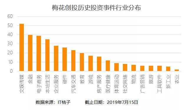 投资事件行业分布中,梅花创投更关注文娱、金融、电商以及本地生活行业。