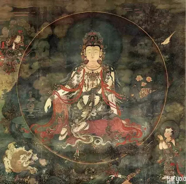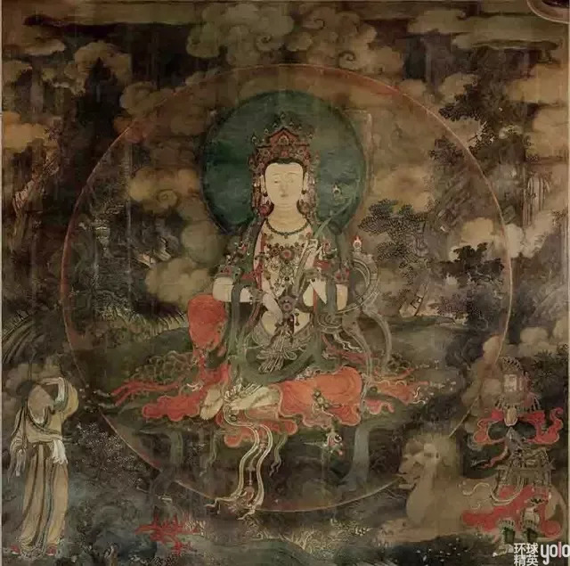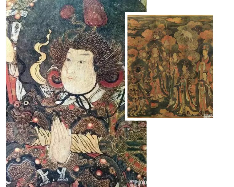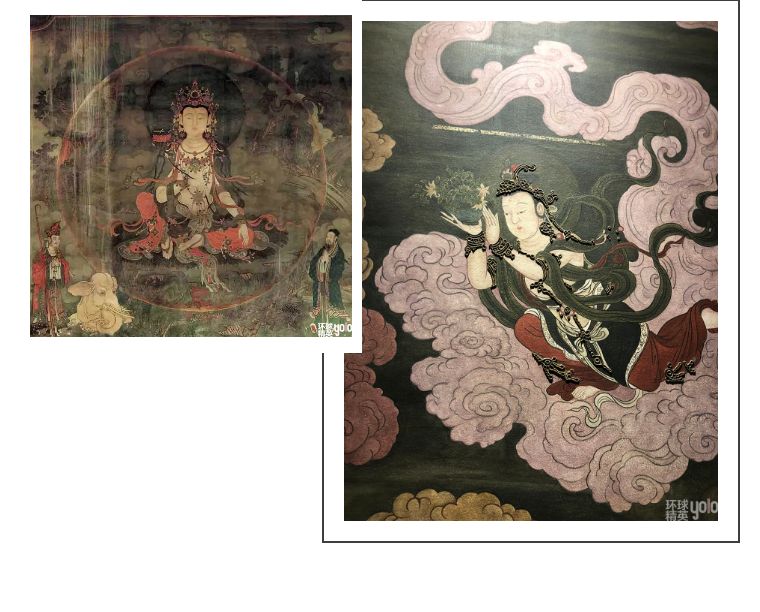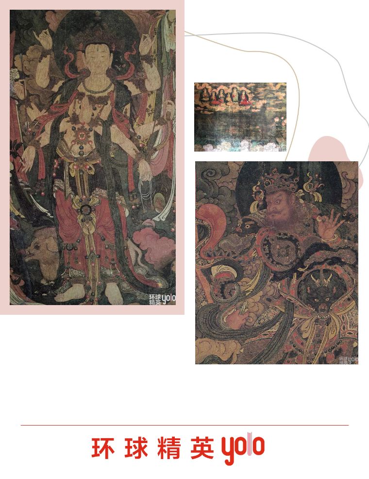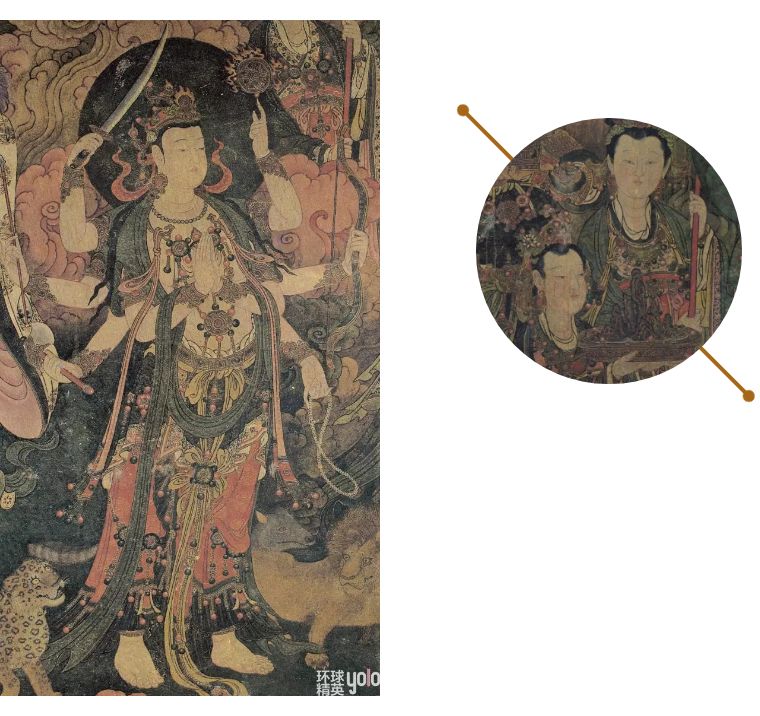 《文殊菩萨图》左下侧绘有坐骑青狮和训狮人。训狮人身披甲胄,佩戴鱼形宝刀,鳞甲闪闪,凸出画面。右下侧绘有一位信士,也有说法是古印度的月盖长者,右手持杖,左手遮荫,满面苍须,随风飘动。《普贤菩萨》图左下绘有六牙白象,右下同样绘有一位信士,被称为最胜老人,与文殊菩萨右下侧的信士相互呼应。