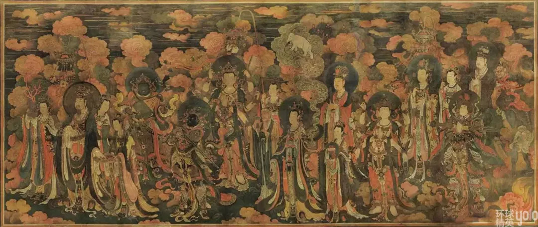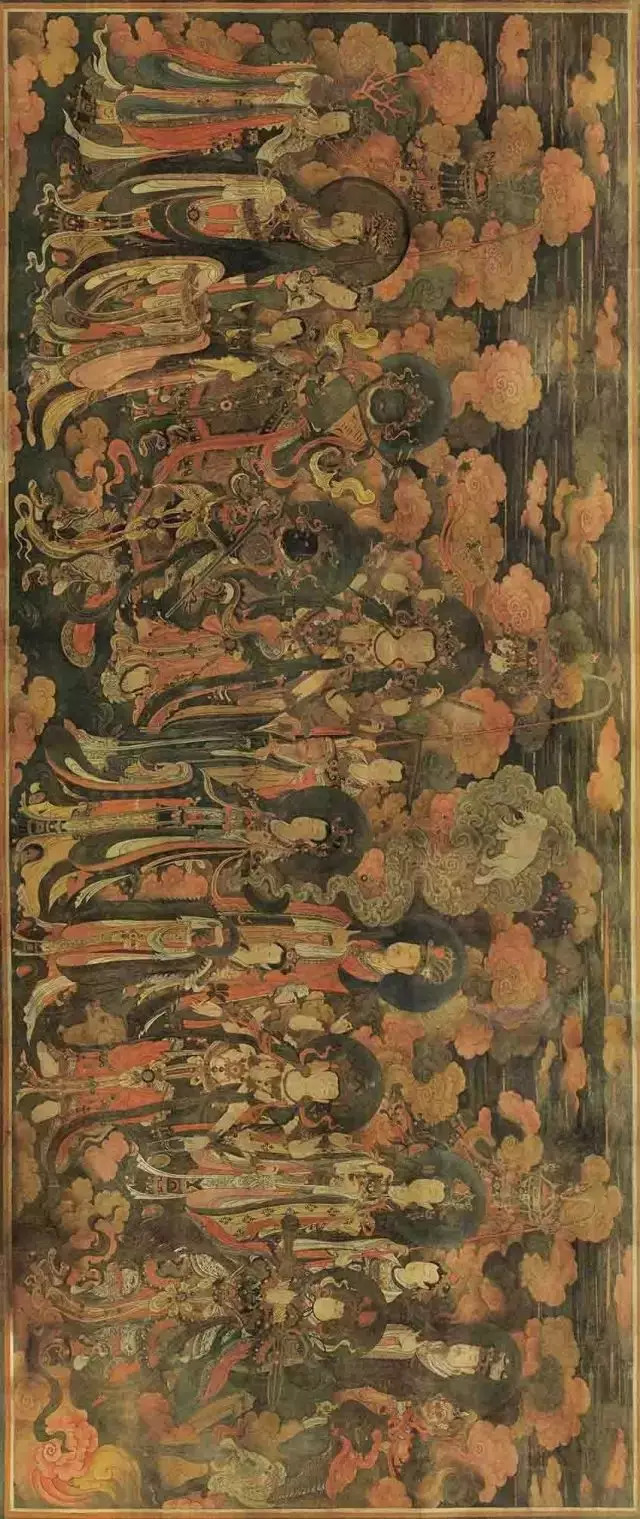 《佛众赴会图》位于大殿东西山墙两壁,共两铺,高3.2米,长22米,面积70.4平方米。壁画内容为佛祖讲经说法,佛众菩萨赴会参禅的场景。两幅壁画除了细节和人物上不一样,构图上基本一样,都是大致分成两个部分,祥云以上为天界,以下为人间。天界有飞天、四菩萨、五方佛、六观音,很自然的三无成组,两幅壁画共32位佛众诸神。均端坐于莲座之上,面相端庄,衣褶流利。由缭绕的祥云将他们相互联系,又相互分割。人间则绘有花草树木和山石溪流。