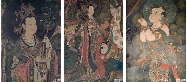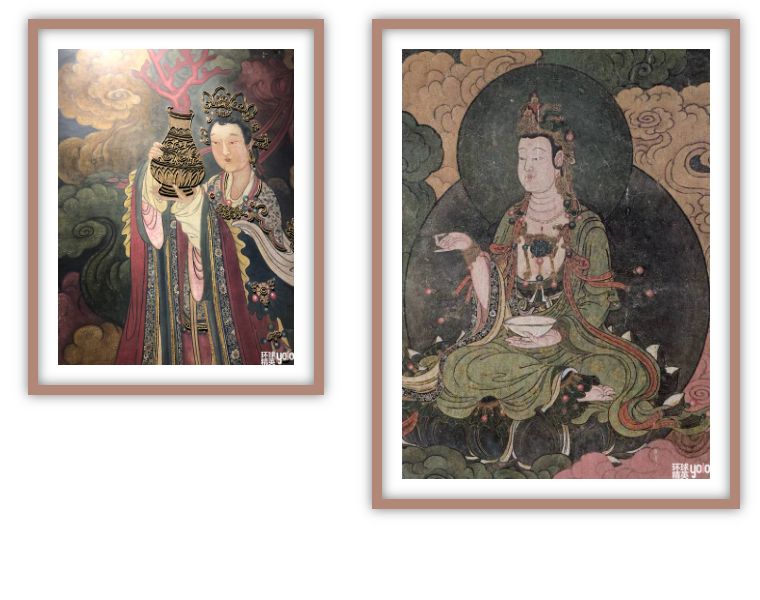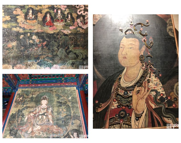 佛龛背后绘的是观音、文殊和普贤三尊菩萨以及他们的脊属和坐骑。其中以中间的《水月观音》画得最为传神和出色,被宗教、美术界誉为观世音菩萨造像之最。她宽肩袒胸、肩披轻纱,薄似蝉翼,胸饰璎珞,表情温和安详,屈左膝盘左而坐。宝冠项圈、璎珞花饰样样精制。一袭薄纱从肩头披下,披纱的图案是六菱花瓣,每一花瓣竟然都是由48根比发丝还细的金线组成,沥粉堆金,闪闪发光,细如蛛丝,薄如蝉翼;水月观音的面部近一平方尺,层层晕染之下,观音的皮肤显得粉嫩滋润,白里透红,给人以清新明净、和蔼祥瑞、出世超凡之感。壁画左下部是善财童子,右下角绘有观音坐骑金毛犼,左上部绘有一只鹦鹉,右上部绘有韦陀护法神,巧妙安排成对称平衡布局;壁画运用宝冠、璎珞、天衣、纱幔、宝光等诸多佛教经典元素美化造像。