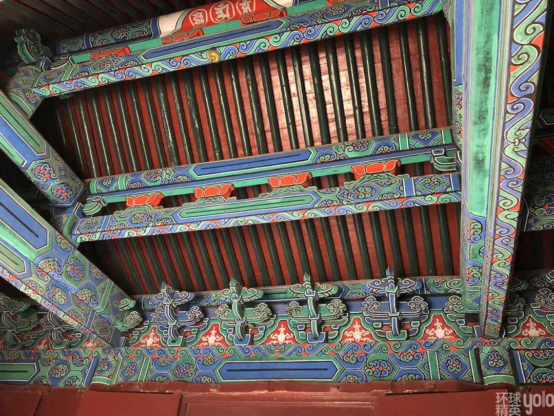 壁画大处气势磅礴,小处精致入微。要是目力足够好,你可以看到哪怕一平方厘米的地方,都层层叠叠地布满花纹——或许是菩萨衣袂上的团花卷草,或许是天王盔甲上的带扣,也或许是动物的毛发,细密有致,蓬松柔软。可以说法海寺壁画“没有一处废笔”,足以“媲美敦煌”。