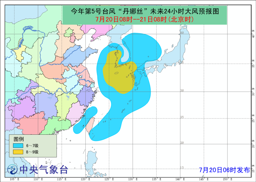 中央气象台7月20日06时继续发布台风蓝色预警:今年第5号台风“丹娜丝”(热带风暴级)的中心今天(20日)早晨5点钟位于韩国全罗南道西南方约205公里的黄海南部海面上,就是北纬33.5度、东经125.5度,中心附近最大风力有9级(23米/秒),中心最低气压为988百帕,七级风圈半径200-350公里。