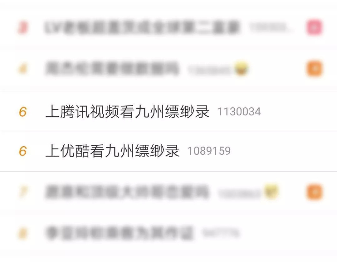比如说,前几日开播的《九州缥缈录》,作为暑期档腾讯视频和优酷的重点项目,两家在营销上一直在battle,互不相让,于是就出现了堪称经典的“争榜事件”。在微博热搜的广告位上,前一秒是#上优酷看九州缥缈录#,下一秒是#上腾讯视频看九州缥缈录#,两边都紧咬不放,一刻不得松懈。