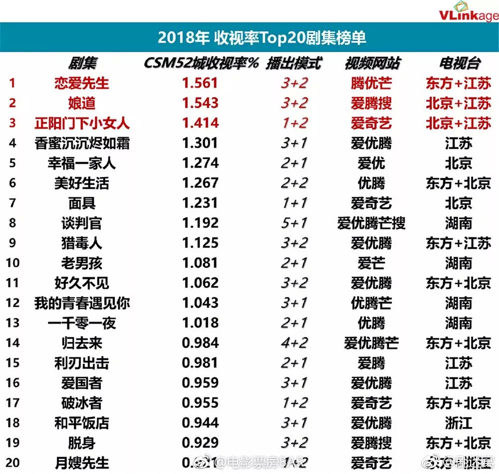 通过2018年收视率TOP20的剧集榜单不难看出,基本上这些上星电视剧在视频网站都采取了联合播出的形式,同时也有二分之一的剧集都是两家电视台联合播出的,并且排名前三的剧集均来自于联合播出。