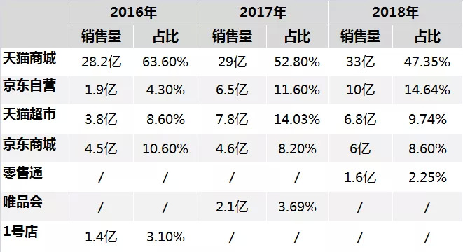其二,2017年尚有唯品会前五大渠道队列,此后的2018年核心渠道全部在京东和阿里渠道,在2018年猫超销量和占比略有下降,但同年主打夫妻老婆店铺货的速卖通异军突起,全年拿到1.6亿元销量,当年入仓模式总销量接近27%;
