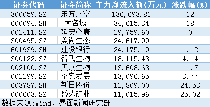 Wind提供的数据显示,本周获主力资金持续净流入且五日累计净流入额超过1亿元的个股共有11只,较上周增加6只。其中,东方财富(300059.SZ)、大名城(600094.SH)、延安必康(002411.SZ)本周累计净流入额居前,分别为13.67亿元、3.46亿元、2.98亿元。