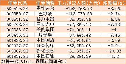 在本周主力资金持续净流出个股中,共计51只个股累计主力资金净流出额超过1亿元,较上周减少50只。这其中,贵州茅台(600519.SH)、五粮液(000858.SZ)、格力电器(000651.SZ)等个股本周遭主力抛售幅度最大,其累计净流出额分别为19.28亿元、11.38亿元、8.61亿元。