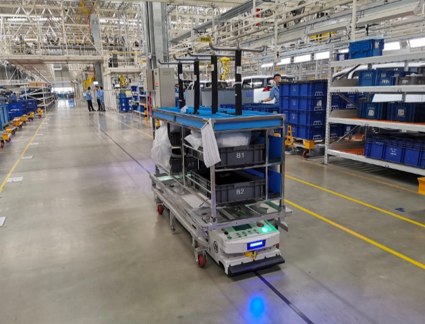 智能配料车(SPS)在车间内自动运送专属零件到相对应的装配线上。该技术可准确解决订单式生产所带来的配送混乱的难题,也避免了人工配送有可能产生的错误。
