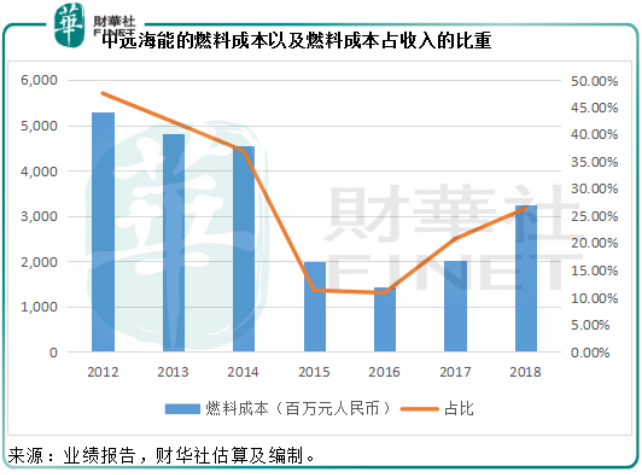 从上边两张图可以看出,油价走势与中远海能的燃料成本走势十分相似,2012年至2014年油价高位徘徊,中远海能的燃料成本同样高企;2015年油价下跌,中远海能的燃料成本在2015年及2016年处于较低的水平;2017年起油价回升,燃料成本也随之上涨。