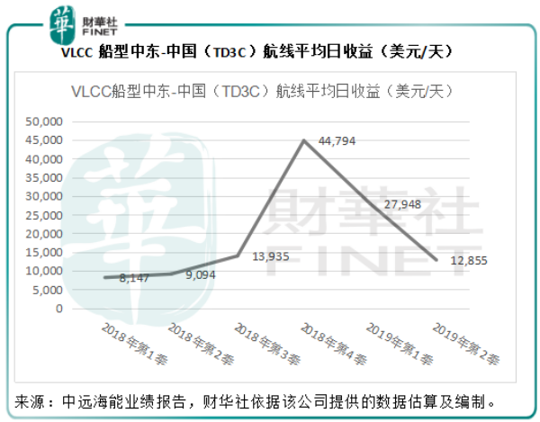 回到中远海能的业绩预告,该公司指2019年上半年TD3C(中东海湾-中国)航线超大型油轮(VLCC)平均等价期租租金(TCE)约为20360美元/天,同比增加136%,其他典型航线的TCE同比增加约60%至290%。财华社依此推算,2019年第2季的VLCC船型中东-中国(TD3C)航线平均日收益为12855美元/天,同比增加41.36%,但较2019年第1季下降54%,这可能与国际贸易关系变化、美国可能降息令美元汇价扭转涨势以及霍尔木兹海峡油轮事件导致第二季油价波动加剧有关,而财华社估计,这可能也是中远海能第二季利润低于第一季的原因。