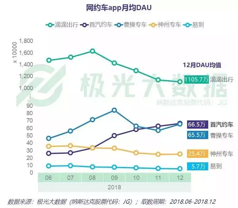 而来自极光大数据今年3月初公布的数据显示,在顺风车下线后的2018年下半年,滴滴的日活(DAU)从8月份最高点的逾1600万,降至12月底的1105万。从下方DAU走势图,可以看到跌掉的500万日活,有相当大的一部分是顺风车下线所导致的。