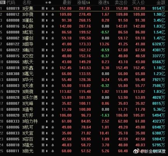 7月22日讯,科创板今日鸣锣开市,首批25只新股正式在上交所开始交易,开盘全部大涨,安集科技涨287.85%,报152元;澜起科技268.15%,报91.30元;科创板第一股华兴源创涨128.35%,报55.40元。