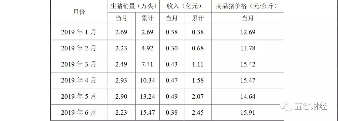 从以上数据就能发现,2019年6月,龙大养殖生猪销量仅为2.23万头,远远低于4月和5月,仅和2月相当。也就是说,尽管销售均价环比上涨,但是,生猪销量环比下滑较大,致使6月收入低于5月。