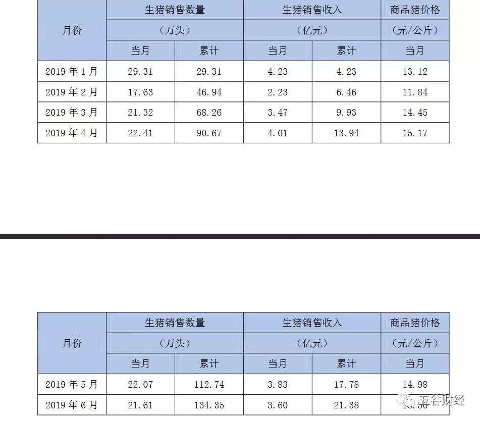 作为“养猪大王”的温氏股份,2019年6月销售商品肉猪192.98万头,收入33.35亿元,销售均价15.60元/公斤,环比变动分别各为-4.29%、2.93%和10.48%。