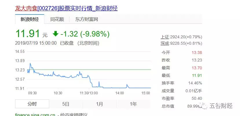就在龙大肉食股价大跌之前的一个交易日,即7月18日,盘中最高价13.9元,股价创历史新高,收于13.23元,上涨4.67%。