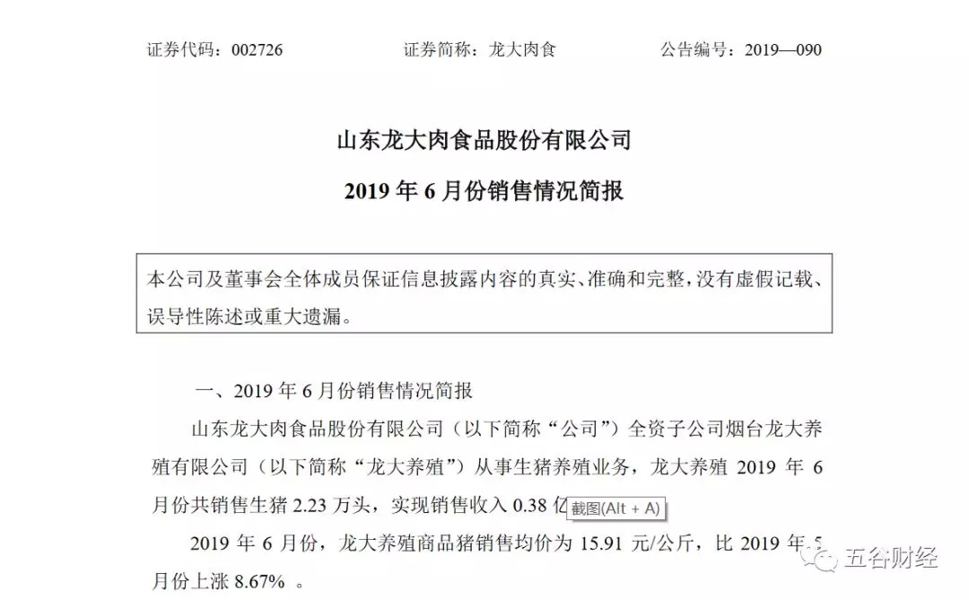 日前,龙大肉食发布公告称,作为全资子公司的烟台龙大养殖有限公司(下称“龙大养殖”)从事生猪养殖业务,2019年6月,龙大养殖的商品猪销售均价为15.91元/公斤,比2019年5月上涨8.67%。