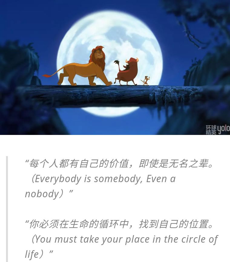 无论从故事表达,还是美术和音乐等各方面评估,《狮子王》都创造了空前的艺术成果和商业价值,更因此被称为“迪士尼复兴时代最伟大的经典”。我想,动画里那些富有哲理的台词,一定打动、照亮过很多人的内心。