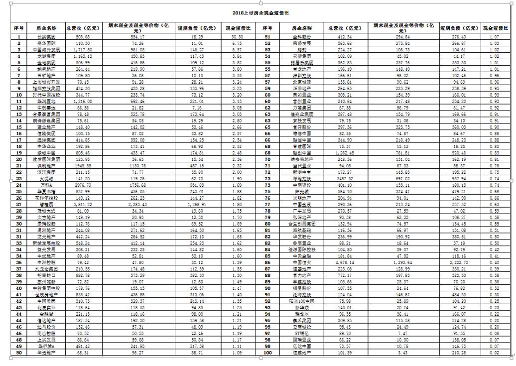 长实集团、嘉华国际、中海地产分别以30.30、6.75、6.57的数值占据了现金短债比前三的位置。发展节奏一向稳健,现金流相对充足,融资成本较低,拥有央企背景的中海,2018年总营收1717亿元,短期负债146.27亿元,现金及现金等价物期末余额为961.05亿元,现金短债比为6.57,可谓各项指标都不错,成为一众央企和国企之中的典型代表。