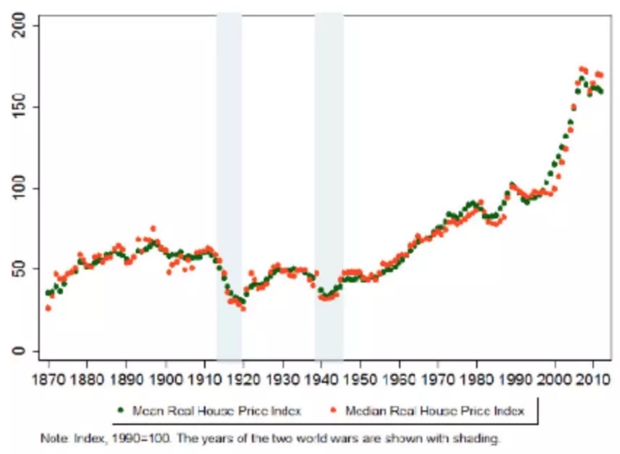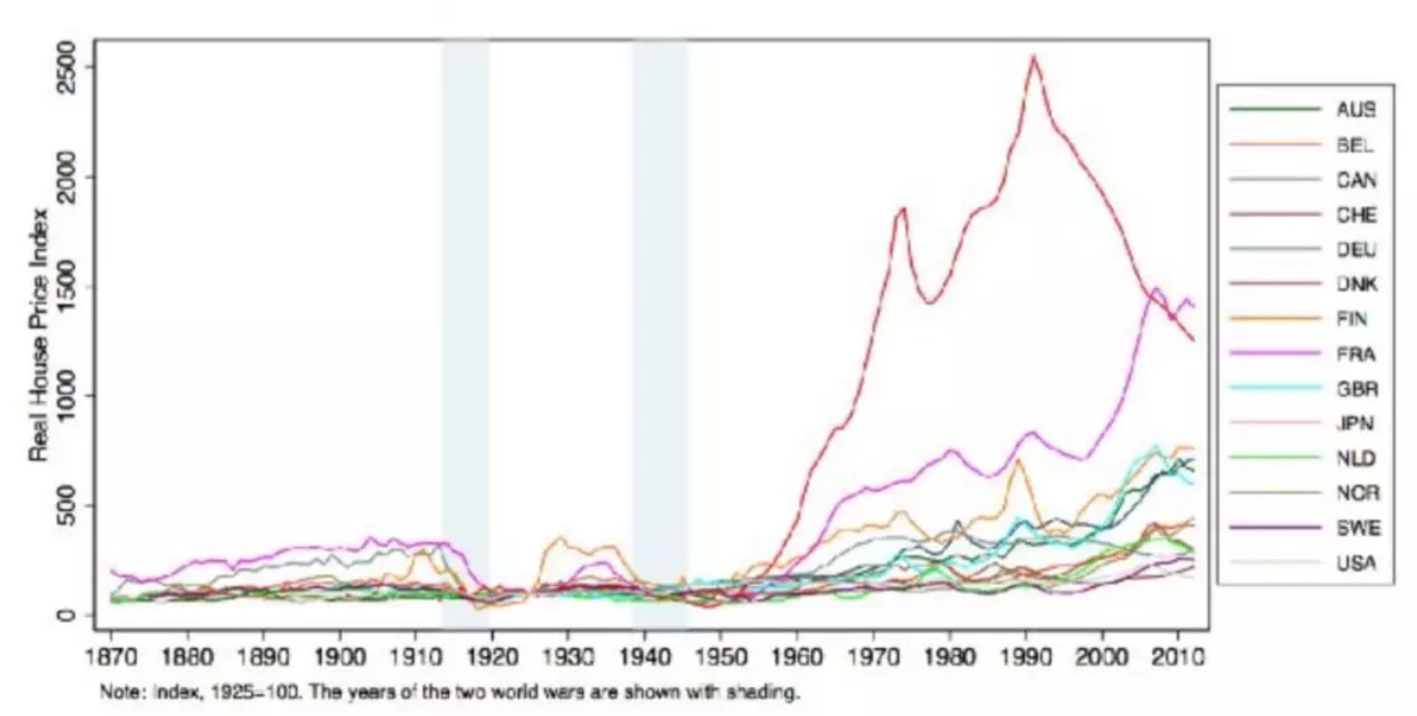 这张图告诉我们的事情是,从历史经验上看,整体的房价在二战以后,它有一个普遍上涨的规律,这是发达国家的情况。