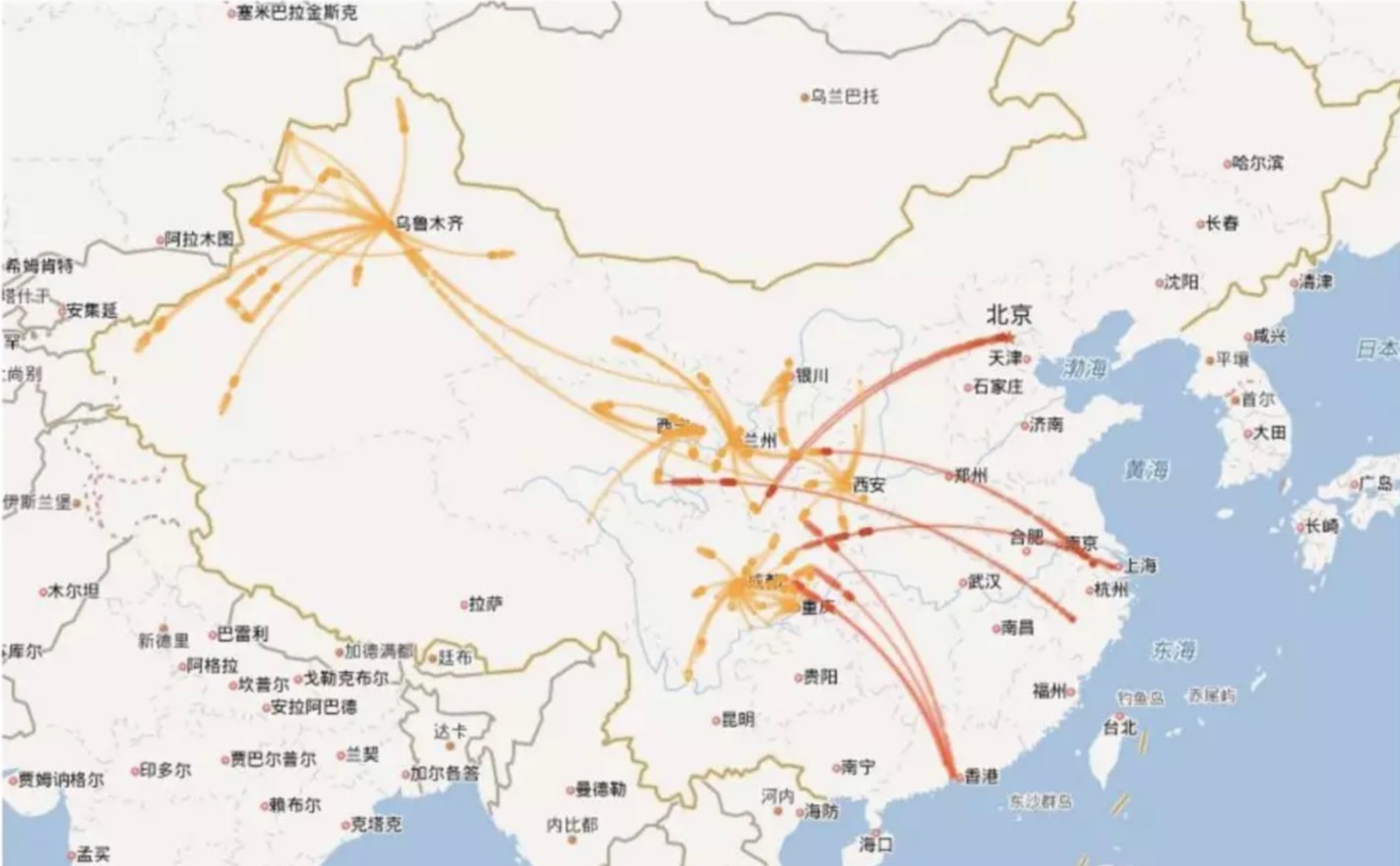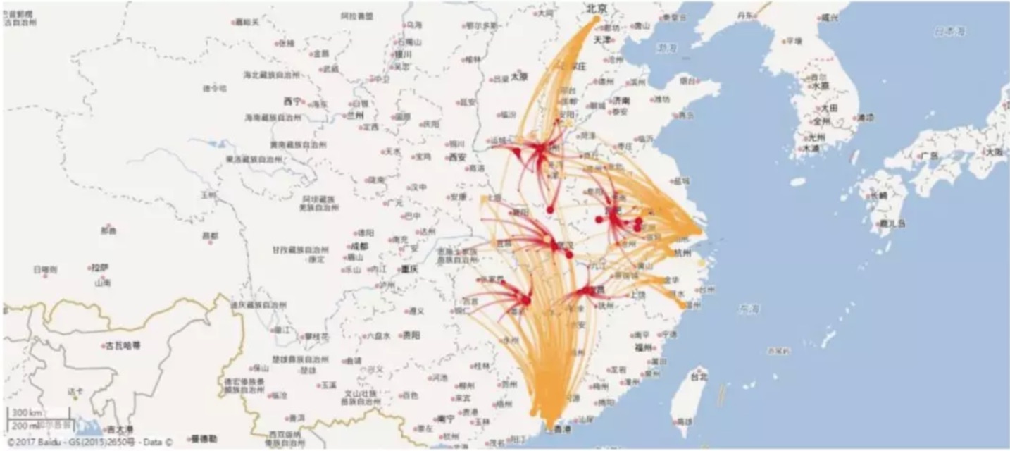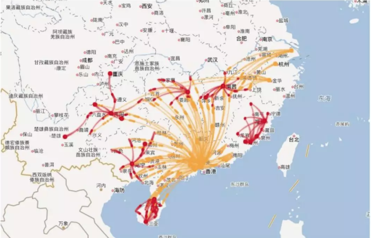 最后这张图就是华南地区,它因为区域邻近的原因,大部分的人是往珠三角跑的,剩下的就是去一些其他地方,比如说福州、厦门、然后贵阳这些地方。