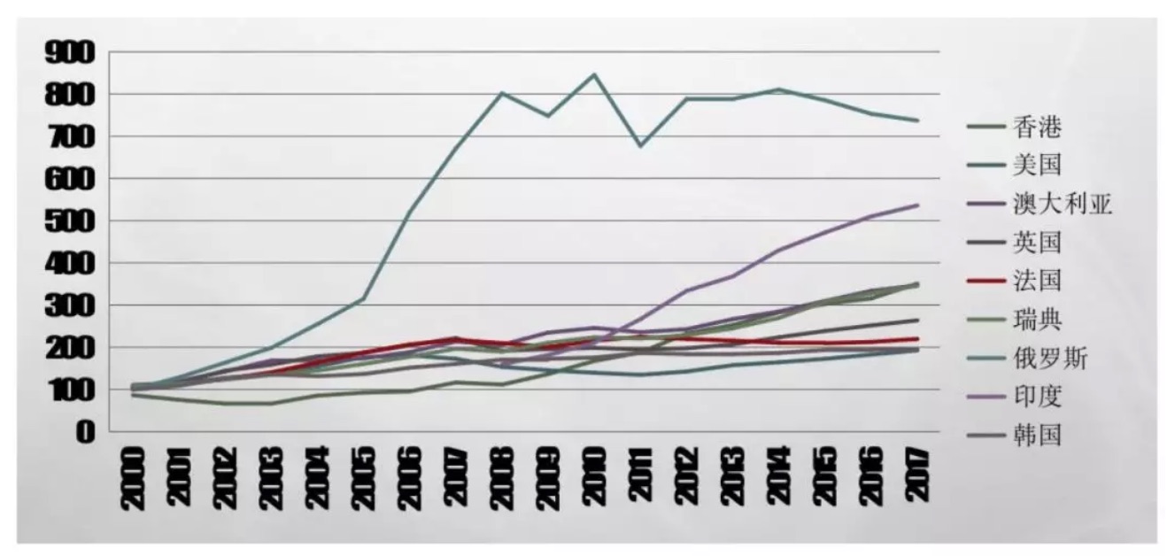 发展中国家在新世纪以来是一个什么情况呢?这张图是国际清算银行最近的一个数据,显示的是2000年到2017年,即便有像美国次贷危机的情况,其实总体上,主要国家的能找到数据的地方,房价也是基本是上涨的。