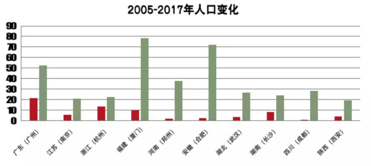说的直白一点,农村的房子的价值就不大。这张图是2005年到2017年一些主要省份的人口增速和其最核心城市的人口增速。