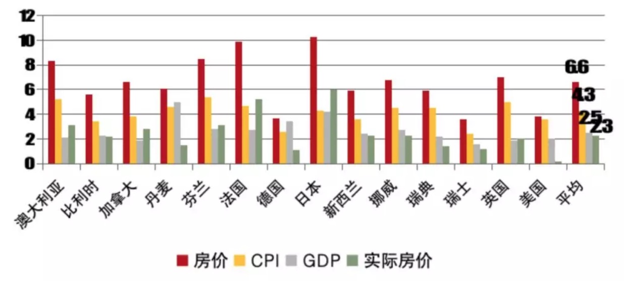 这张图是把很多的发达国家的增速图放在一起,它们的平均值如下:名义房价是6.6%,GDP增速是在2.5%;实际房价在扣除通货膨胀之后是2.3%,这是发达国家的一个情况。