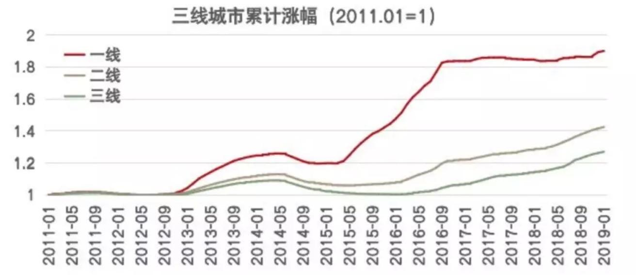 这张图是统计局的数据,一二三线城市的一个房价增速指数图,那么这张图上有一个规律。就是2013年以前,大中小城市的房价增速是差不多的,但是2013年以后就出现了分化,变成了大城市大涨,中城市中涨,小城市小涨。这张图告诉我们的意义是什么呢?就是现在买房不能是哪里都买了。