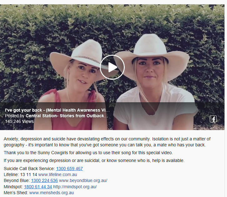 例如,“中央车站”曾发起关爱澳大利亚偏远地区牧民心理问题的活动。“中央车站”认为:“焦虑、抑郁和自杀对我们的(牧民)社区造成了毁灭性的影响。与世隔绝不仅仅是地理上的问题(注:澳洲大部分牧场位处偏远地区)。知道有一个可以和你说话的人,一个支持你的同伴真的很重要。如果你正在经历抑郁或有自杀倾向,或认识受此困扰的人,你可以得到帮助。”