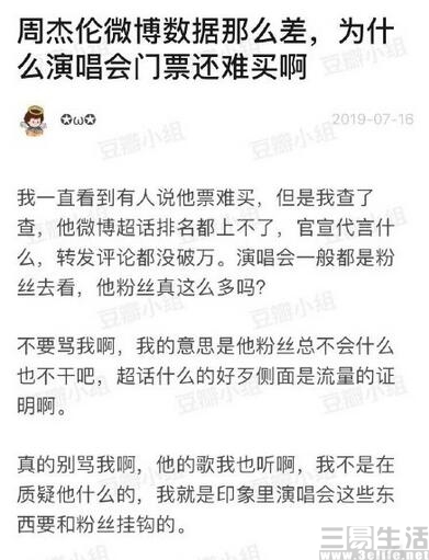 2019年7月16日,周杰伦世界巡回演唱会南京站开售,仅用了不到30秒的时间所有价位票就全部售罄。与此同时,一位网友在豆瓣上发帖询问,“周杰伦微博数据那么差,为什么演唱会门票还难买啊”,并进一步怀疑,“他微博超话排名都上不了,官宣代言什么,转发评论都没破万。演唱会一般都是粉丝去看,他粉丝真这么多吗?”