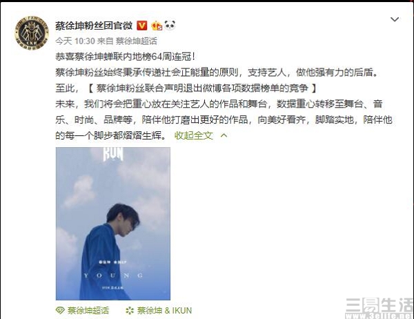 在周杰伦三个字登顶微博明星榜之后,粉丝也一转此前的鸡血状态,纷纷表示打榜没有意义,只是争一口气,如今已成第一,不必继续下去。而这场较量中另一家引起关注的蔡徐坤粉丝们,因为存票在上周用光今日已被朱一龙数据超越,以及“来去之间”聊天记录曝光等影响,其粉丝团官微今天更是宣告,将“退出微博各项数据榜单的竞争”。