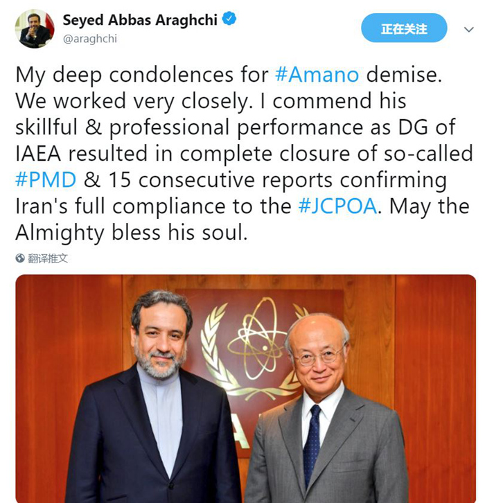 周一,伊朗副外长阿拉基奇(Seyed Abbas Araghchi)在Twitter发文悼念天野之弥,赞扬他在确认伊朗遵守协议规定上的“专业表现”。