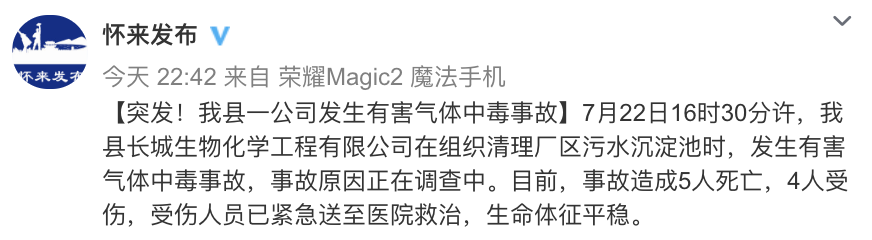 中共怀来县委宣传部官方微博晚间通报,7月22日16时30分许,该县长城生物化学工程有限公司在组织清理厂区污水沉淀池时,发生有害气体中毒事故,事故原因正在调查中。目前,事故造成5人死亡,4人受伤,受伤人员已紧急送至医院救治,生命体征平稳。