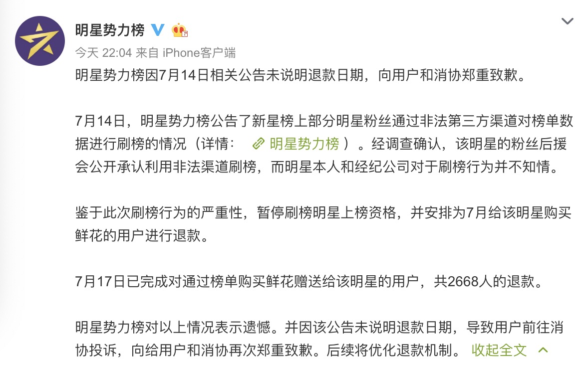 7月22日晚,新浪微博明星势力榜发布微博称,因7月14日相关公告未说明退款日期,向用户和消协郑重致歉。