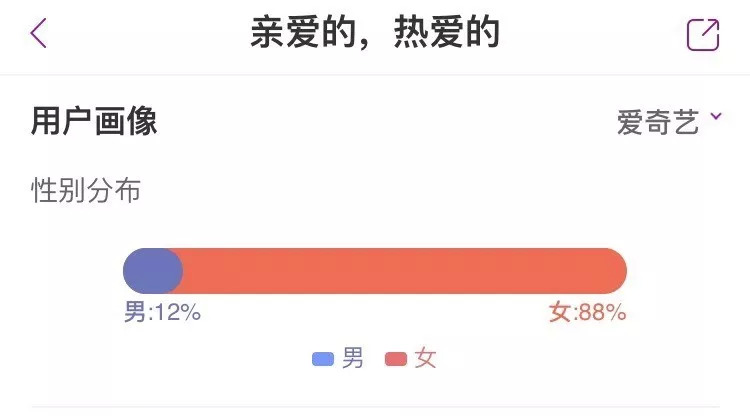 而高糖的甜宠剧满足了很多女性观众对爱情的幻想,所以在电竞的外衣下,《亲爱的,热爱的》仍是一部换玛丽苏剧。“甜宠+电竞”的结合的确吸引了大量女性观众,据艺恩数据显示,该剧女性受众占比达到了88%。