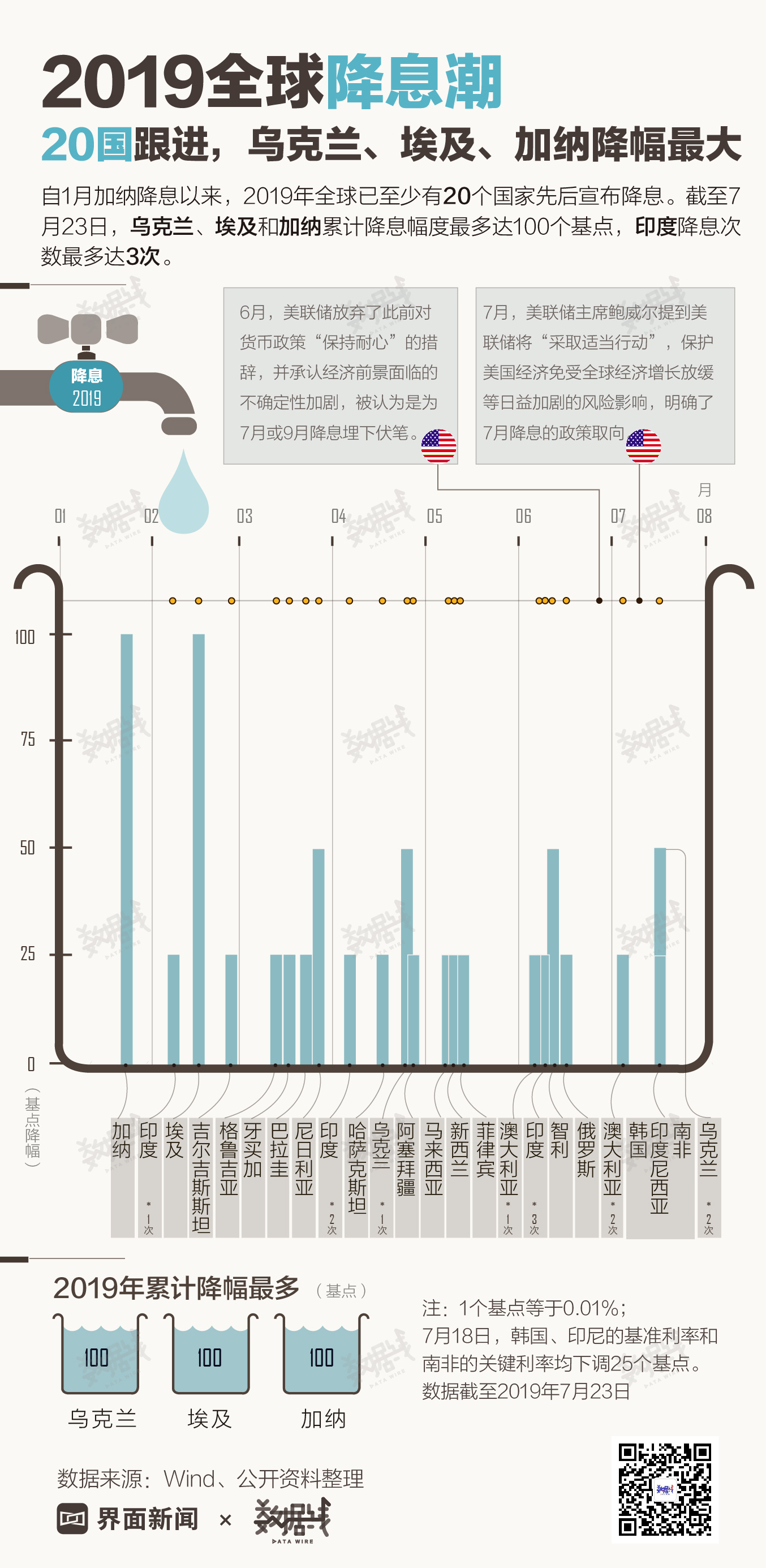 2019年全球已至少有20个国家先后宣布降息。截至7月23日,乌克兰、埃及和加纳累计降息幅度最多达100个基点,印度降息次数最多达3次。