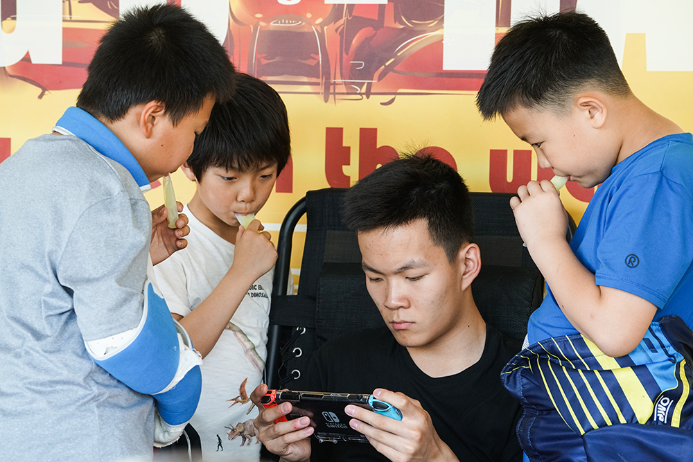 陈小乖在和俱乐部里的另一个小男孩争论关于“速度快慢”的问题。这个小男孩的形象有些特别——右手绑着石膏。他在俱乐部里晃来晃去,一会儿去摩托赛车那边瞧瞧,一会儿来卡丁车这边和小车手们闹闹。